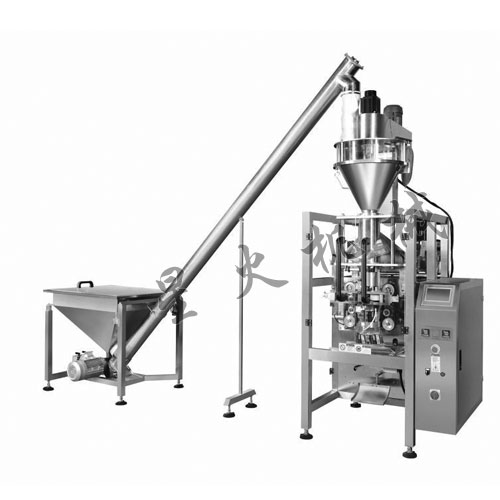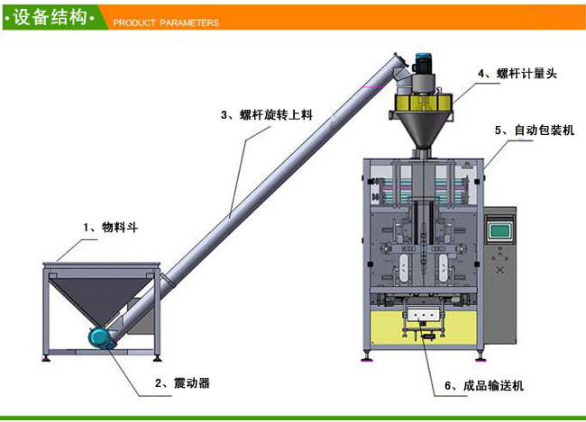接通電源將溫度設置恒溫→設置包裝機參數(制袋尺寸及包裝重量)→人工上料到儲料斗振動下料至螺桿提升機→螺桿計量器→包裝機→打印生產日期→制袋→充填物料→充氣→封合包裝→切斷→包裝成品輸出全過程;