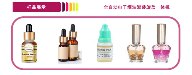 該機主要適用于50毫升以內電子煙油、滴眼液、指甲油、眼影、精油等產品的自動灌裝、加塞和旋蓋。