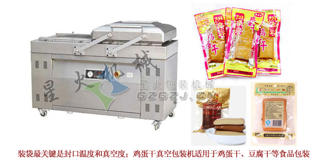 雞蛋干是改變形狀的雞蛋。是以雞蛋為原料的新食品。是將雞蛋全蛋濃縮加工而成,產品營養價值高,含有豐富的優質蛋白質,而且包裝輕便易攜帶,成為新時尚休閑零食;雞蛋干的生產工藝比較復雜,用到的設備有:打蛋機——攪拌桶——灌裝機——蒸煮鍋——鹵煮鍋——真空包裝機——殺菌鍋等;其中星火食品包裝機械生產的蛋液灌裝成型機就起到了灌裝定型的作用;