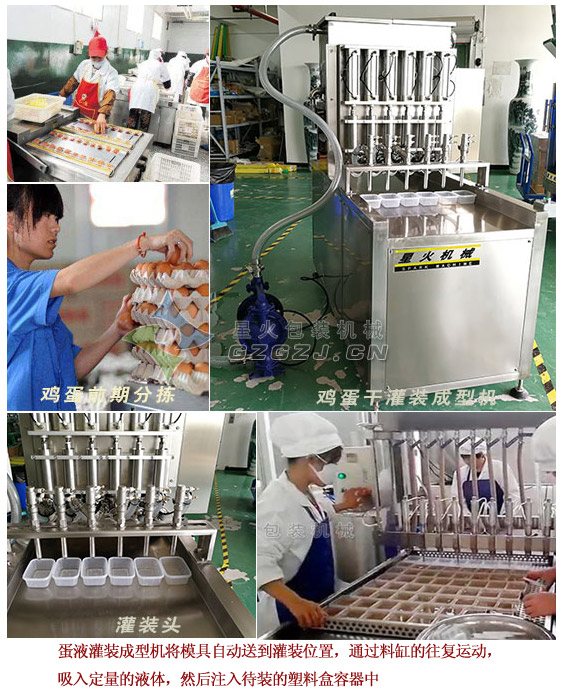 蛋液經過攪拌之后就進入了定型程序,蛋液灌裝成型機將模具自動送到灌裝位置,蛋液灌裝機的計量缸分別連接灌裝頭,通過料缸的往復運動,吸入定量的液體,然后注入待裝的塑料盒容器中;整機采用全不銹鋼產品制成,拆裝簡單,易清洗,符合食品衛生要求,氣動定量灌裝,六個灌裝嘴同時出料,結構合理,操作方便,易于維護,維修,便于清洗;雞蛋干蛋液灌裝成型機已成為雞蛋干生產線中必不可少的灌裝設備;雞蛋干灌裝成型后,然后鹵制,較后經過真空包裝機包裝,成品基本上就完成啦