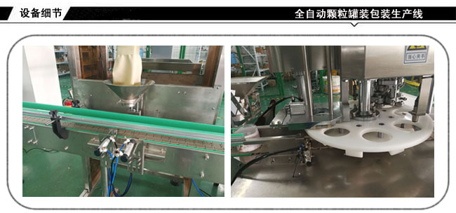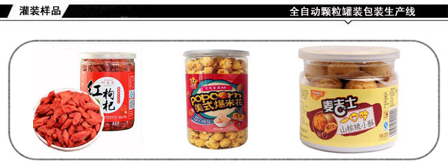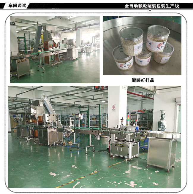 全自動顆粒罐裝包裝生產線-堅果灌裝封口貼標生產線根據不同用戶的瓶裝,聽裝,桶裝,標準瓶,異形瓶及實際產品特性和用戶要求實現自動化;該設備能夠實現人工上瓶、備料后,自動理瓶、稱重、灌裝、旋蓋、封口、貼標、收罐等全過程的自動運行。減少勞動力,節約成品,實現無人化包裝生產