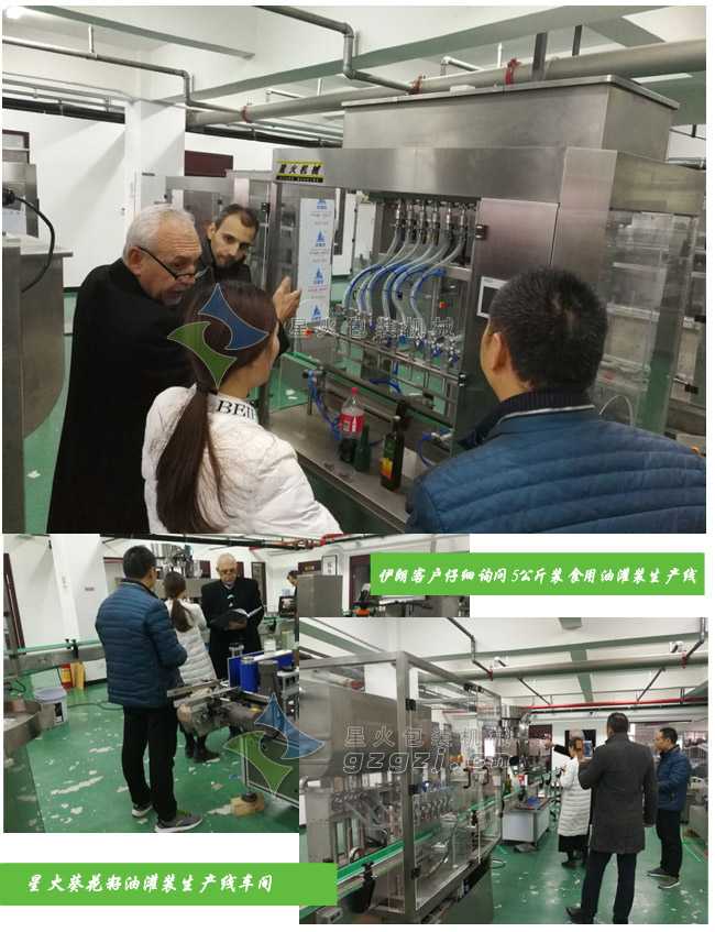 目前市面上常見的食用油包裝多數是5L即5公斤包裝的,我們星火包裝機械也專門推出了針對5L裝食用油的灌裝生產線設備,這條灌裝生產線有灌裝機-壓蓋機-貼標機-噴碼機等設備組成,一上市就受到廣大油類生產商的追捧,伊朗的客戶再經過電話簡單了解之后也專程來到我們的車間參觀并進行了詳細的咨詢